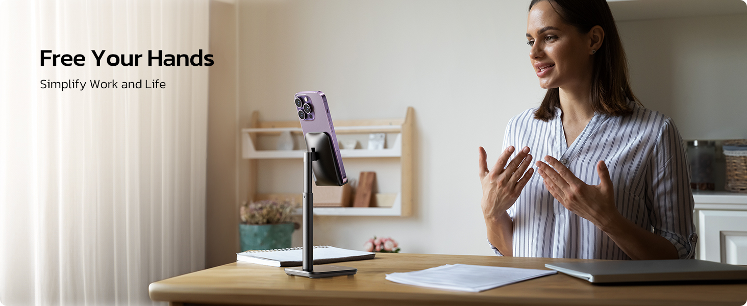 This height and angle adjustable phone stand supports all smartphones and small tablets (4-8 inches, up to 13mm thick). With a 10°-45° tilt range and height adjustment from 6.3 to 9 inches, it promotes ergonomic posture and reduces neck/back strain. Its anti-skid silicone pads protect devices from scratches while providing a stable, hands-free experience—perfect for professional and home office setups.