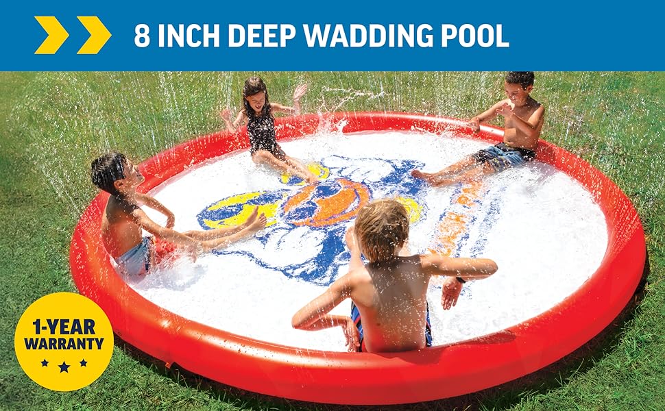 The WOW Sports Giant Splash Pad is a durable inflatable wading pool designed for both kids and adults. Measuring 10 feet in diameter, it features a heavy-duty PVC construction for safety and longevity, along with a built-in sprinkler system for continuous water flow, making it the perfect addition to your summer activities.
