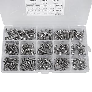 The Walfront 180Pcs Stainless Steel Screws Round Head Self-Tapping Assorted Screw Set is a comprehensive assortment of high-quality screws designed for both professionals and DIY enthusiasts. With four different sizes (M3, M4, M5, M6) and a durable storage box, this kit ensures you have the right screw for any task while keeping your workspace tidy.