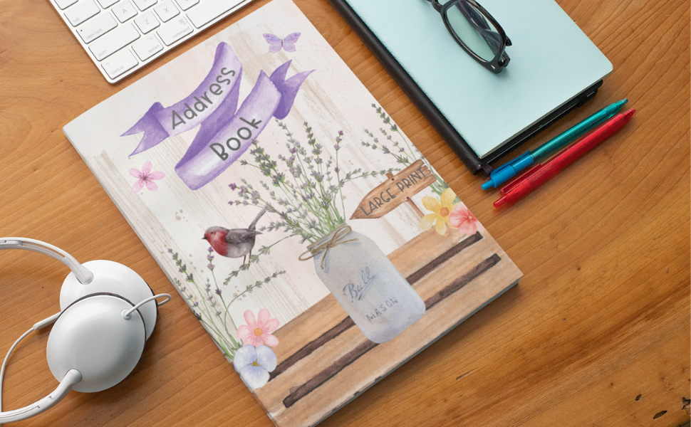 Address Book Large Print: Address And Birthday Book For Seniors With Alphabet A-Z Index, Watercolor Lavender Flowers In Jar / Robin Redbreast