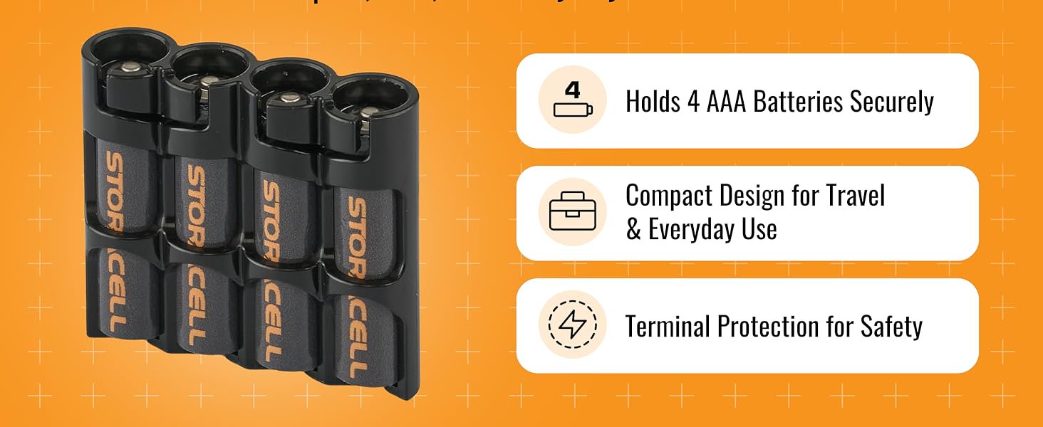 The Storacell Slimline AAA Battery Storage Caddy is a compact, durable organizer that holds 4 AAA batteries securely. Featuring a unique locking mechanism and one-hand dispensing for convenience and safety, it protects battery terminals regardless of orientation. Proudly made in the USA, it’s designed to keep your power essentials accessible and damage-free.