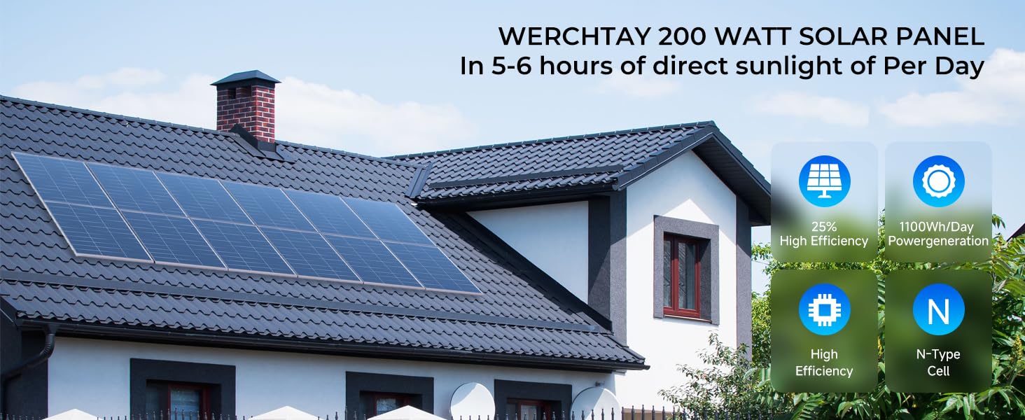 The WERCHTAY 200W monocrystalline solar panel features 18BB high-quality cells with up to 25% efficiency, designed for 12V/24V battery systems. Engineered for durability with a corrosion-resistant frame and certified to withstand extreme weather conditions, it offers easy installation via MC-4 connectors and pre-drilled holes. Ideal for homes, RVs, boats, and off-grid applications, this panel ensures reliable, high-performance solar charging wherever you go.