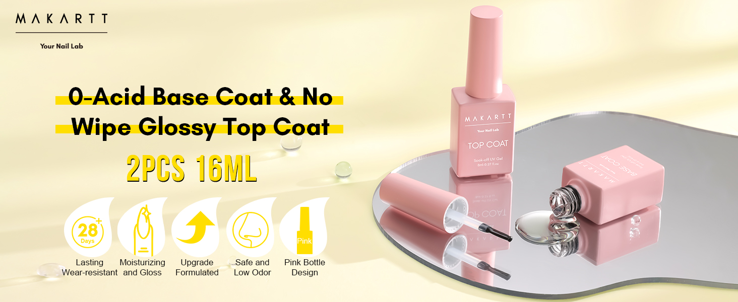 The MakarttGel Top Coat and Base Coat Kit includes an 8ml base coat and an 8ml no-wipe top coat designed for long-lasting, chip-resistant manicures. Compatible with acrylic, gel, dip powder, and natural nails, it features a non-toxic, cruelty-free formula that cures under UV or LED lamps in 60-90 seconds, delivering up to 28 days of glossy, stain-resistant protection.
