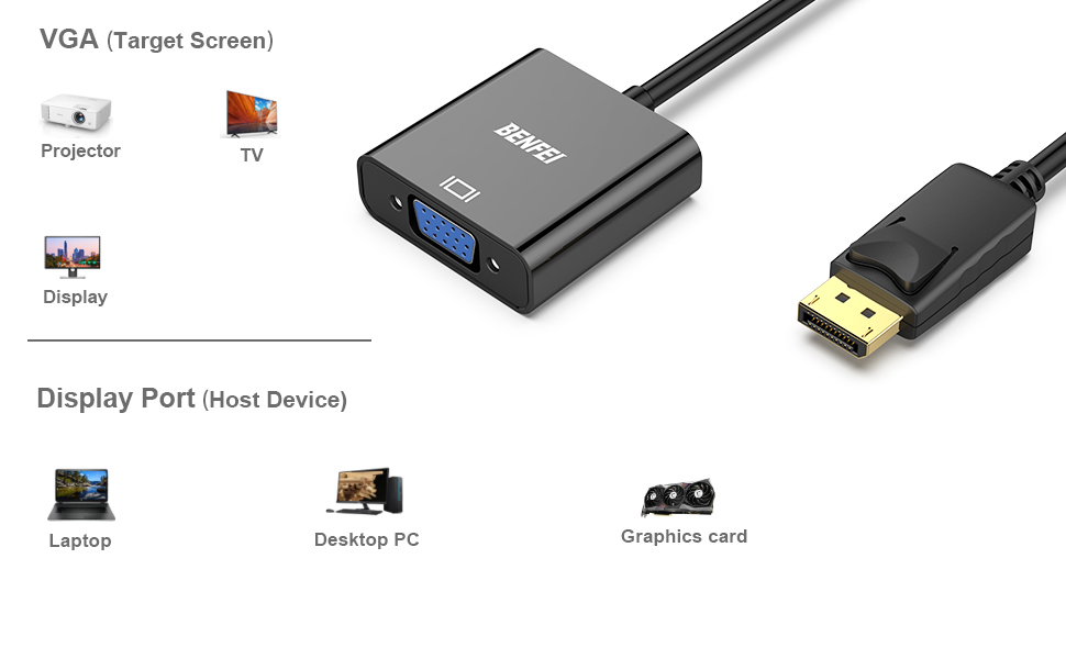 The BENFEI DisplayPort to VGA adapter converts digital DisplayPort signals to analog VGA, supporting up to 1080p Full HD resolution. Featuring gold-plated connectors and a secure latch design, it ensures stable, corrosion-resistant connections. Compact and lightweight, it’s perfect for professionals needing reliable display extension or projector connections, backed by an 18-month warranty for lasting confidence.