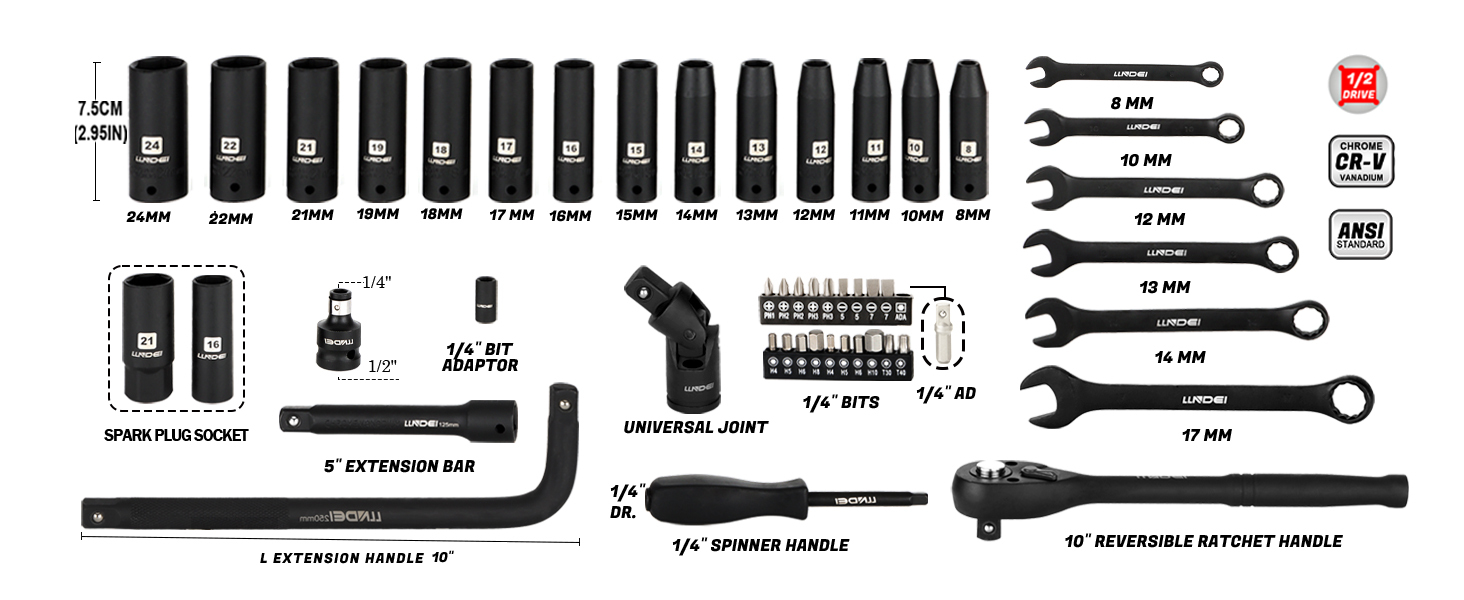 The LLNDEI 49-piece 1/2" drive impact socket wrench set features a robust 72-tooth ratchet, heat-treated chrome vanadium steel construction, and a comprehensive range of deep sockets, spark plug sockets, and combination wrenches. Designed for durability and precision, it comes in a portable blow-molded case with clear size markings and offers universal compatibility with power tools. Backed by a lifetime warranty, this set is engineered to elevate your mechanical projects with professional-grade reliability.