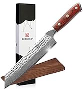 Another excellent product from KEEMAKE. I own their bread knife and was pretty impressed with the craftsmanship. I bought the carving knife subsequently. My first test was carving a turkey breast. The blade was extremely sharp and was able to cut very thin slices from the turkey. While carving the turkey, I had noticed it was shaving bone. A testament to how sharp this knife is. The Damascus is art. The handle appears to be rosewood and feels very comfortable in the hand. The pommel adds to the overall look of this knife with a makers mark stamped on it.