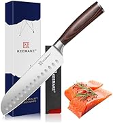 I love that KEEMAKE has their knives available as individual knives versus a set that has a bunch of stuff that I don't need. I'm no expert on steel quality but I have been using this knife and the others that I ordered daily and they have remained sharp. I have not sharpened them yet but I expect that that they will tune up nicely once needed. I bought this and the other knives all in the same style which has an etching on the blade that is reminiscent of a damascus steel (note that they are not, nor do they claim to be damascus-steel). The dark wood handles are such a joy to hold onto even with wet hands. They all have a nice balanced weight and appear to be very well crafted. I have been looking for new knives for a while now and these delivered on quality and price. Keep in mind that the wood handles are real and should not be put in the dishwasher nor should they sit in water for any length of time.