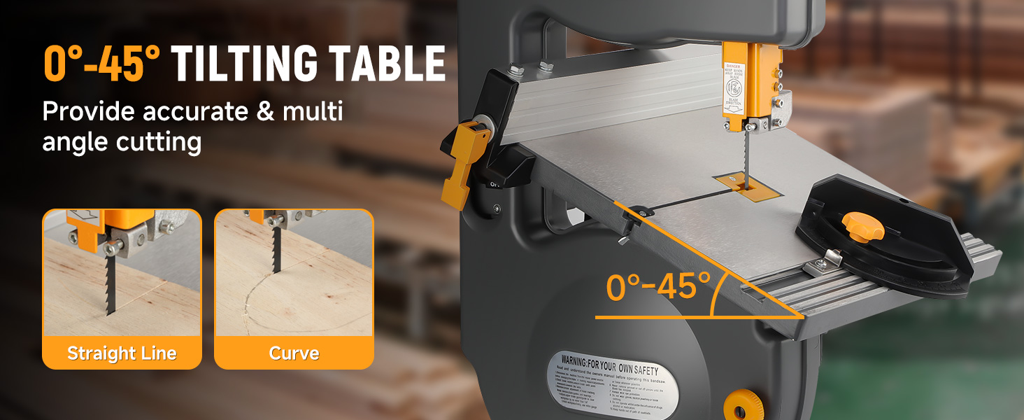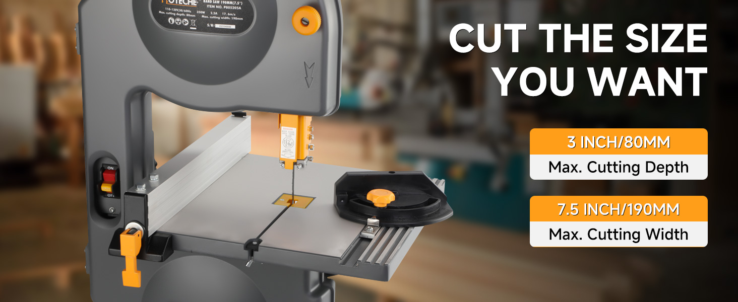 The HOTECHE 7-1/2-Inch Band Saw features a powerful 3-Amp motor with a no-load speed of 14.7 m/s, a versatile cutting capacity of up to 3.2 inches deep and 7.5 inches wide, and a tilting work table adjustable from 0 to 45 degrees. Equipped with a durable 56-inch high-speed steel blade (6 TPI), it offers precision woodworking and metal cutting in a compact, user-friendly design ideal for professionals and DIY enthusiasts alike.