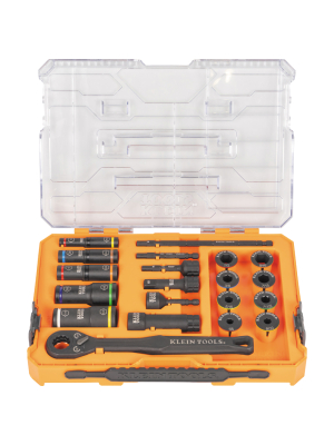 The Klein Tools 65240 KNECT Impact Deep-Well Flip Socket and Low-Profile Pass Through Socket Set is a 20-piece SAE socket collection featuring deep-well and low-profile sockets with color-coded identification. Designed for compatibility with the Klein KNECT system and standard 3/8" ratchets, it includes stackable sockets for compact storage and a MODbox-compatible case for customizable mobile workstations. Crafted from durable stainless steel with a painted finish, this set supports a wide range of fastener sizes from 1/4" to 11/16".