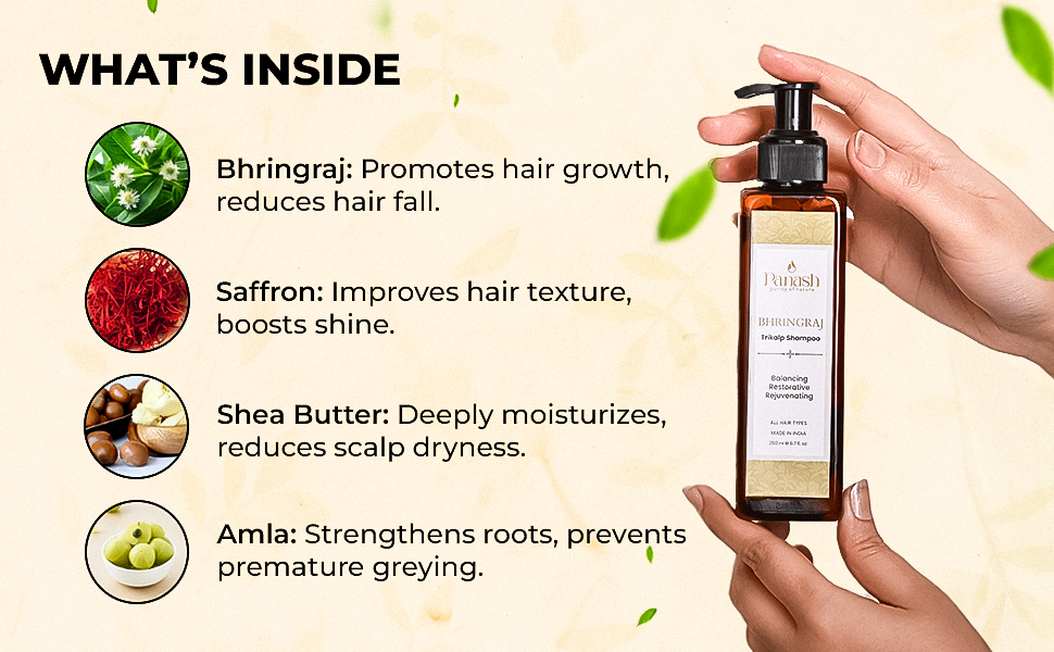 PANASH WELLNESS Bhringraj Ayurvedic Shampoo is a 200ml herbal hair care solution enriched with Bhringraj, Neem, and Saffron. Designed for all hair types, it promotes hair growth, reduces hair fall, nourishes the scalp, repairs damage, and controls dandruff—all without harmful chemicals. Made in India by Aaranyam Natural Cosmetics Pvt. Ltd.