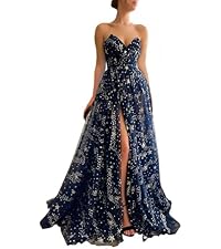 The UZN Navy Blue Tulle Prom Dress is a formal evening gown featuring a strapless V-neck, glittery starry tulle fabric, an A-line silhouette with a split skirt, and practical pockets. Designed for standout occasions, it offers a backless design and a deep navy blue color, available in US size 10. Hand wash only.
