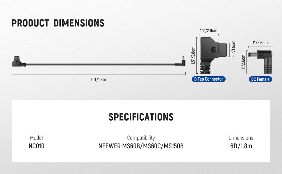 NEEWER 1.8m D-Tap Male to DC Female Power Cable for NEEWER MS60 MS60B MC60C MS150B Continuous LED Video Light NC010